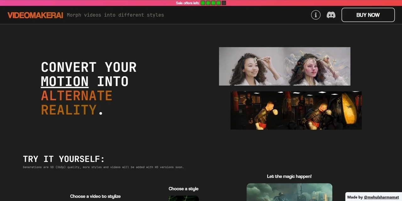 A VideomakerAI egy AI-alapú videó-styling eszköz, amellyel a felhasználók videóikat vizuálisan lenyűgöző műalkotásokká alakíthatják különböző stílusokban